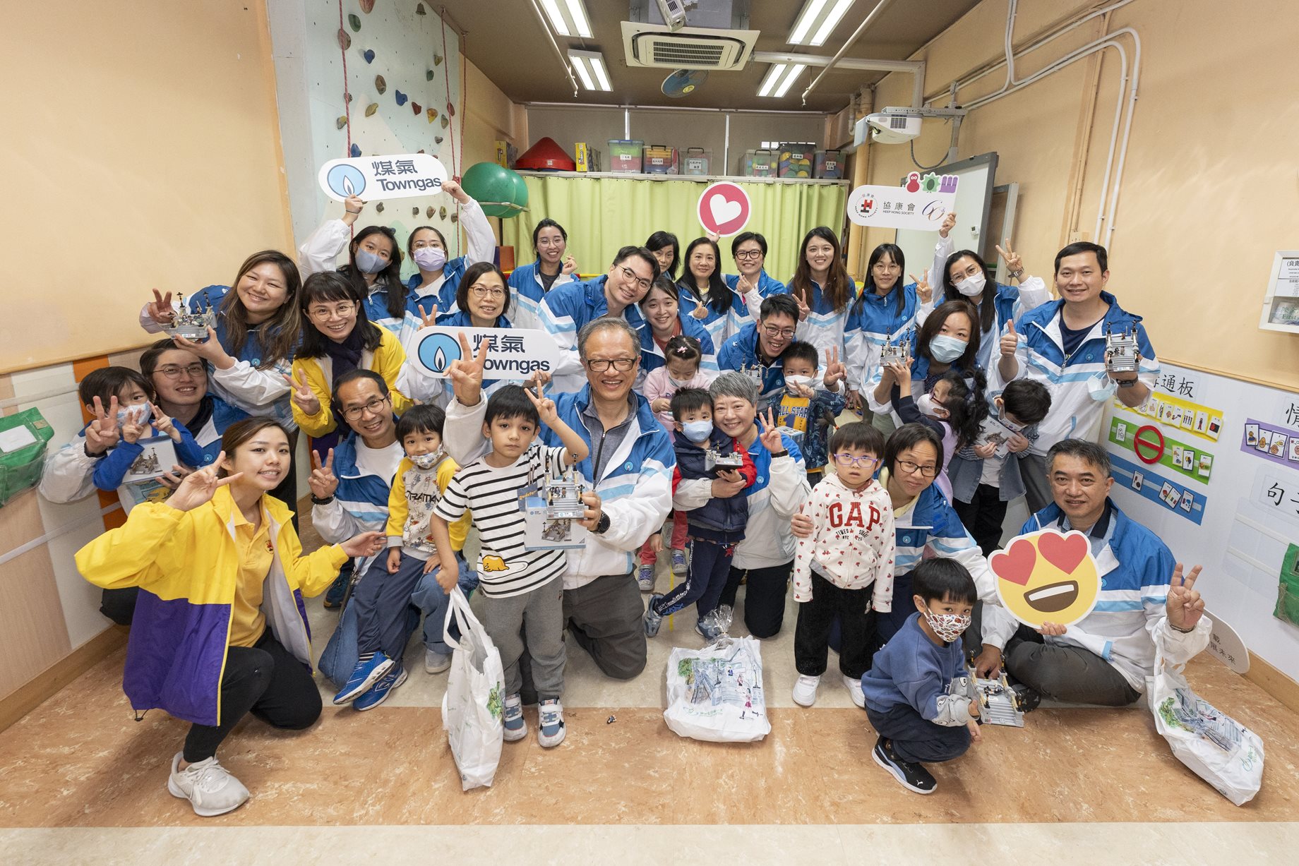Participants of the Towngas × Heep Hong Society “1+1 Building the Future” Workshop and New Year Party, including members of the Towngas Volunteer Service Team, some participating children and instructors from Heep Hong Society, pose for a group photo.