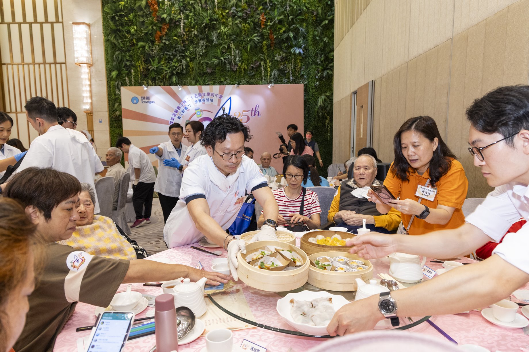 The Towngas Volunteer Service Team organised a luncheon event where Towngas management staff acted as restaurant waiters, receptionists, and managers. The event brought together 200 elderly individuals with swallowing difficulties and their carers, allowing them to experience the joy of dining together.