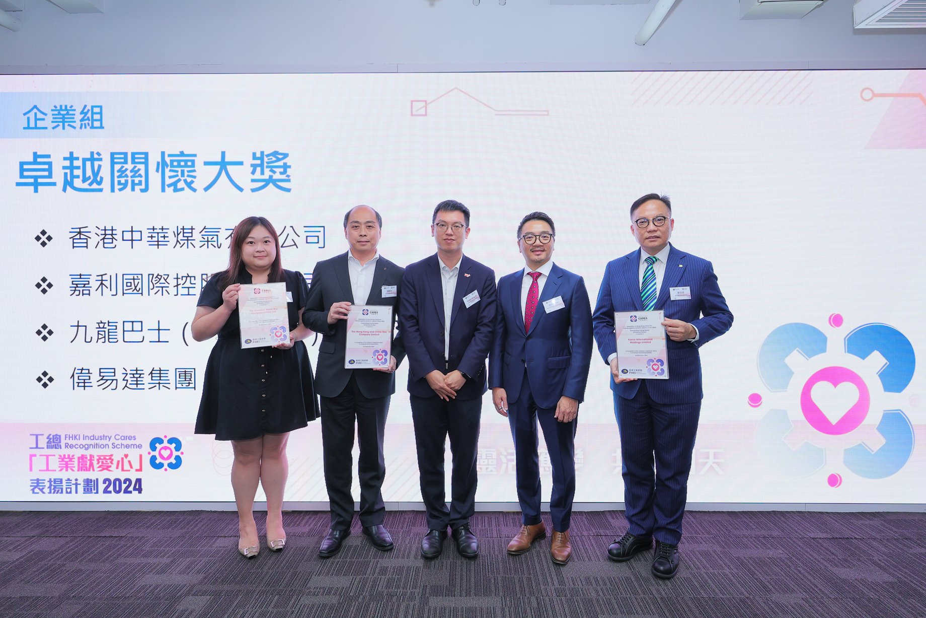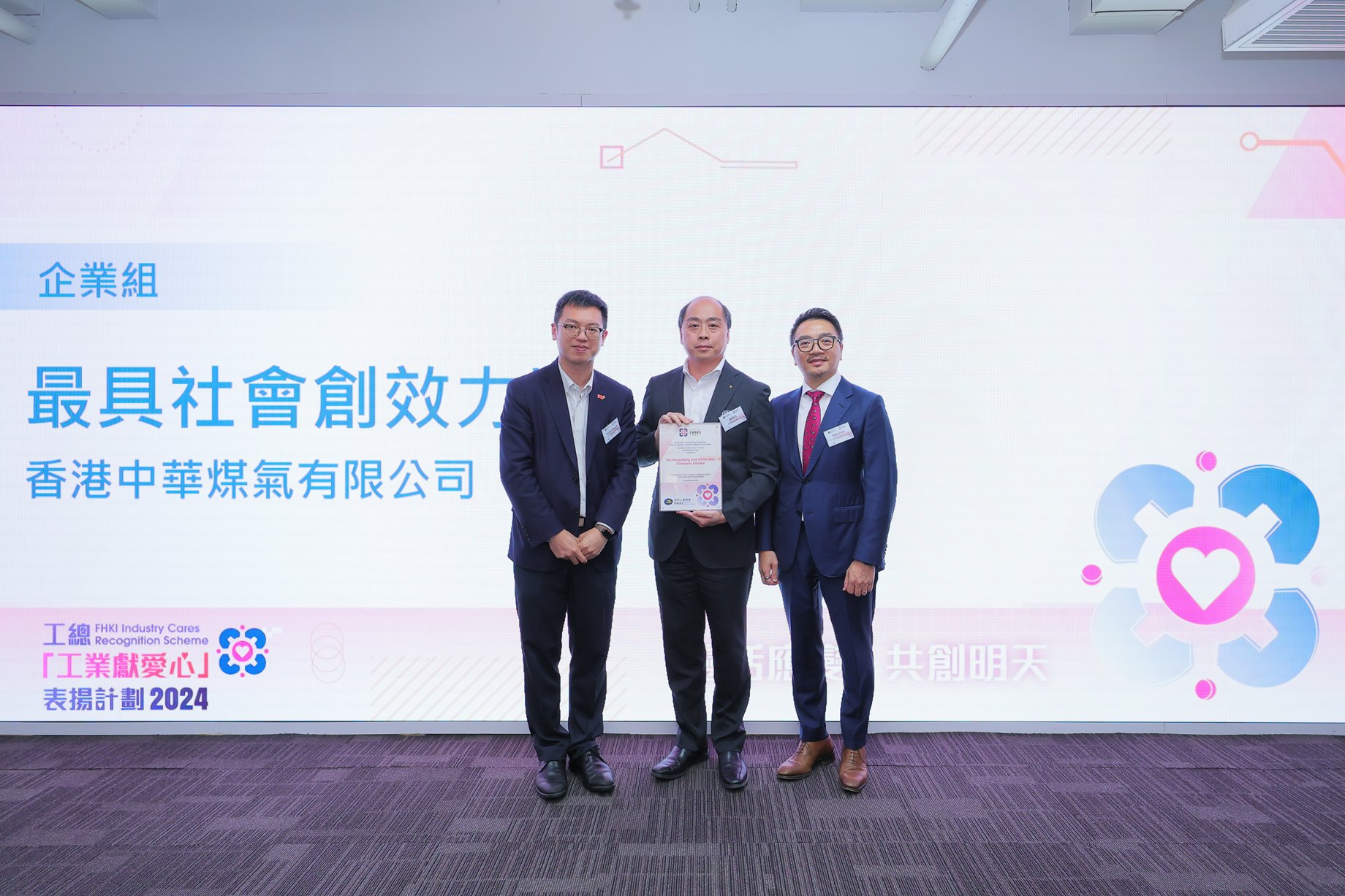 (26 September 2024) The Hong Kong and China Gas Company Limited (Towngas) has been honoured with two prestigious awards at the Federation of Hong Kong Industries’ Industry Cares Recognition Scheme 2024. The Company received the “Best Social Impact Award” and the “Outstanding Caring Award” in the Enterprise Group, recognising its efforts in promoting green energy development in Hong Kong and actively contributing to society.