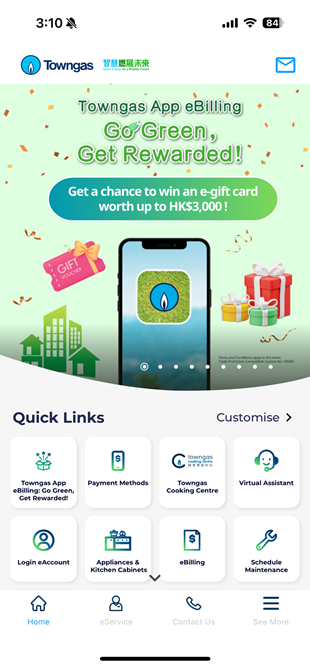 煤气公司手机应用程式提供一站式服务,包括报读煤气表度数、预约维修服务、方便快捷之网上缴费渠道及最新优惠资讯等,为用户提供更优质之体验。
