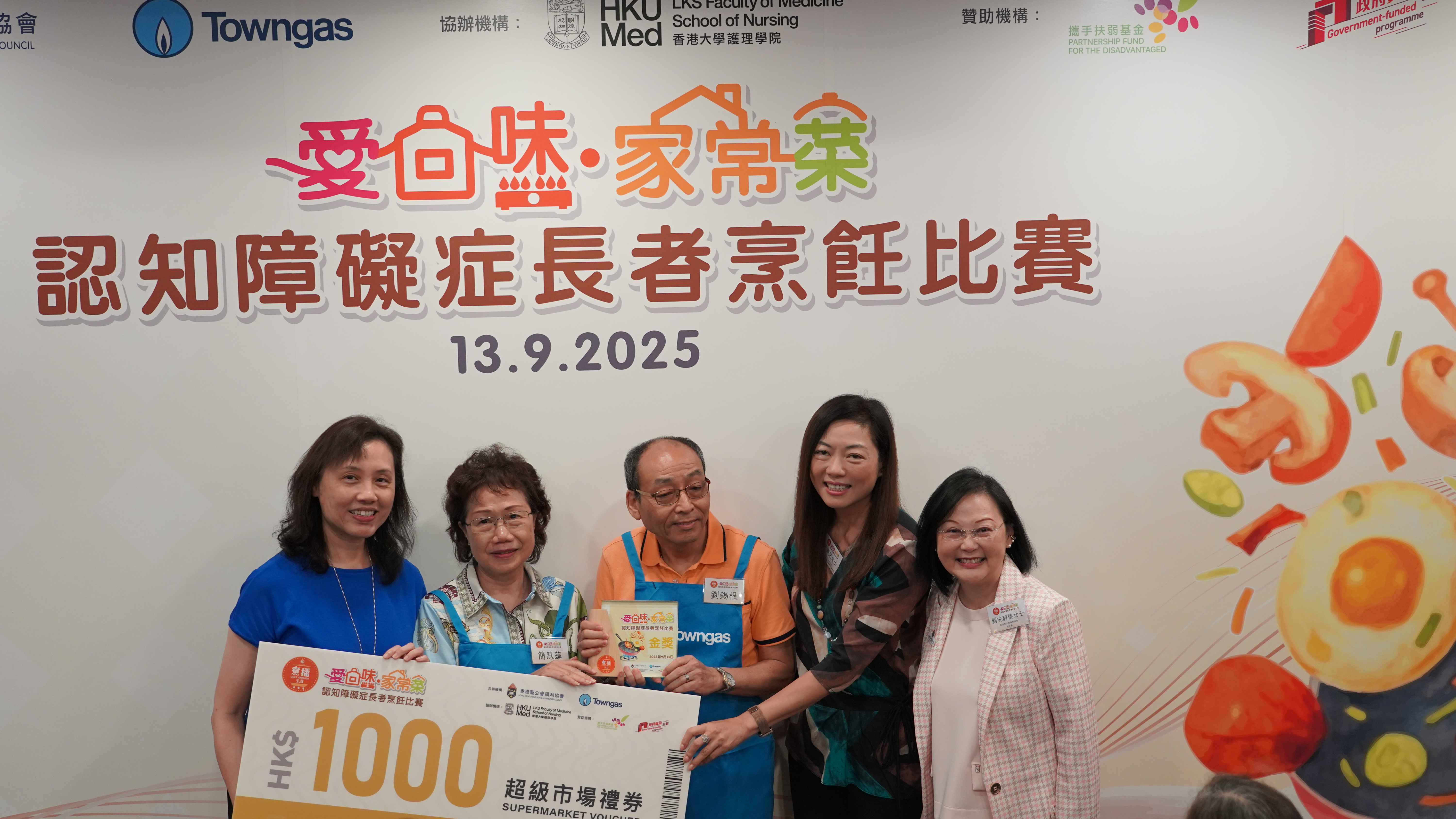 全港首个认知障碍症长者和照顾者的烹饪比赛冠军顺利诞生(左二和左三),由评判煤气公司企业事务及政府关系总监王佩儿(右二)、香港圣公会福利协会总干事刘冼静仪(右一),以及社会福利署助理署长(安老服务)甄丽明(左一)颁发奖项。