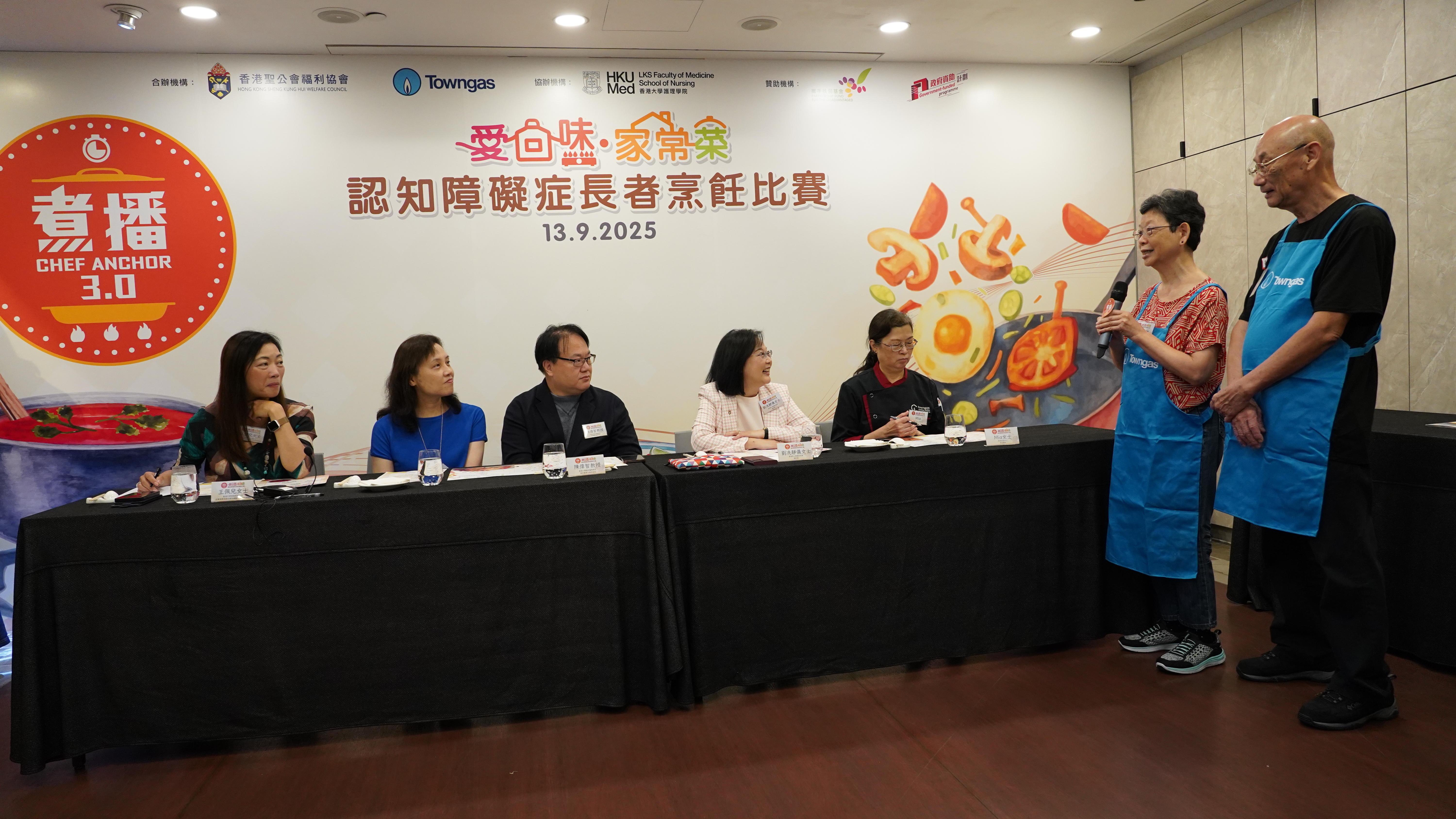 全港首个为认知障碍症长者举办的明火煮食烹饪比赛,评判团包括煤气公司企业事务及政府关系总监王佩儿(左一)、香港圣公会福利协会总干事刘冼静仪(右二)、香港大学临床医学学院精神医学系临床教授陈伟智(左三),以及煤气烹饪中心导师(右一)。他们根据健脑食材选取、味道质感及菜式背后的家庭意义等标准作评选。主礼嘉宾社会福利署助理署长(安老服务)甄丽明(左二)表示,「煮播3.0」计划有助长者在晚年发挥潜能,提升生活质素。