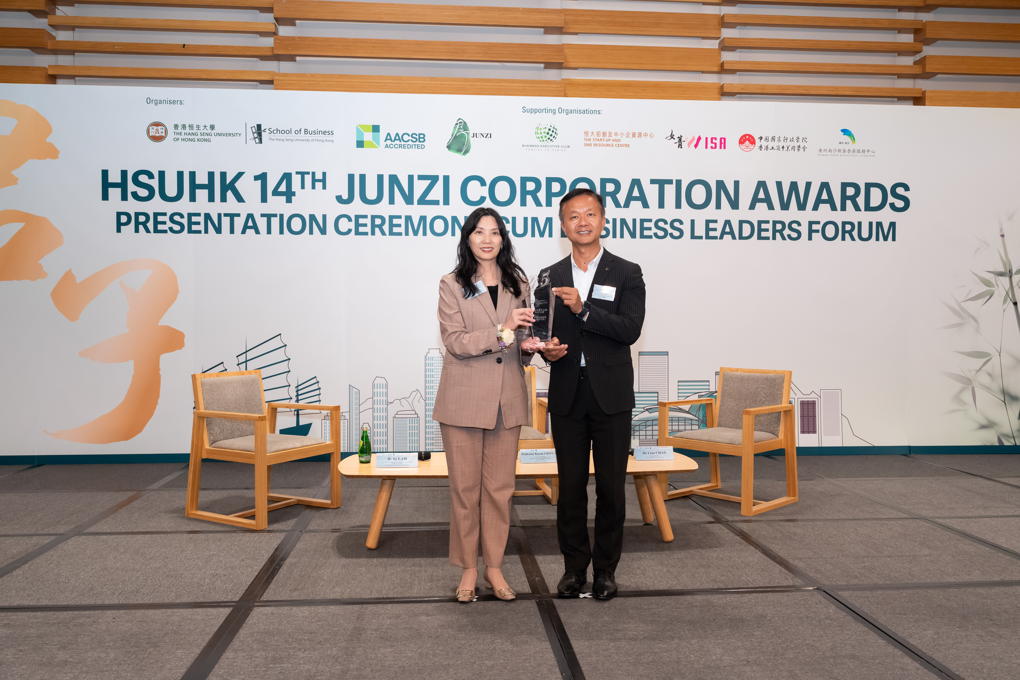 煤气公司于香港恒生大学君子企业颁奖典礼上,获颁「君子企业特别大奖」及「君子企业奖」,由集团企业事务及可持续发展总监李健明(右)代表接受。