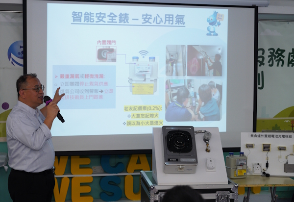 煤气公司高级研发及表计开发经理吴惠华向「留港长者」介绍「智醒生活暖万家」捐赠计划,以智能控制器及智能煤气表提升长者家居安全。