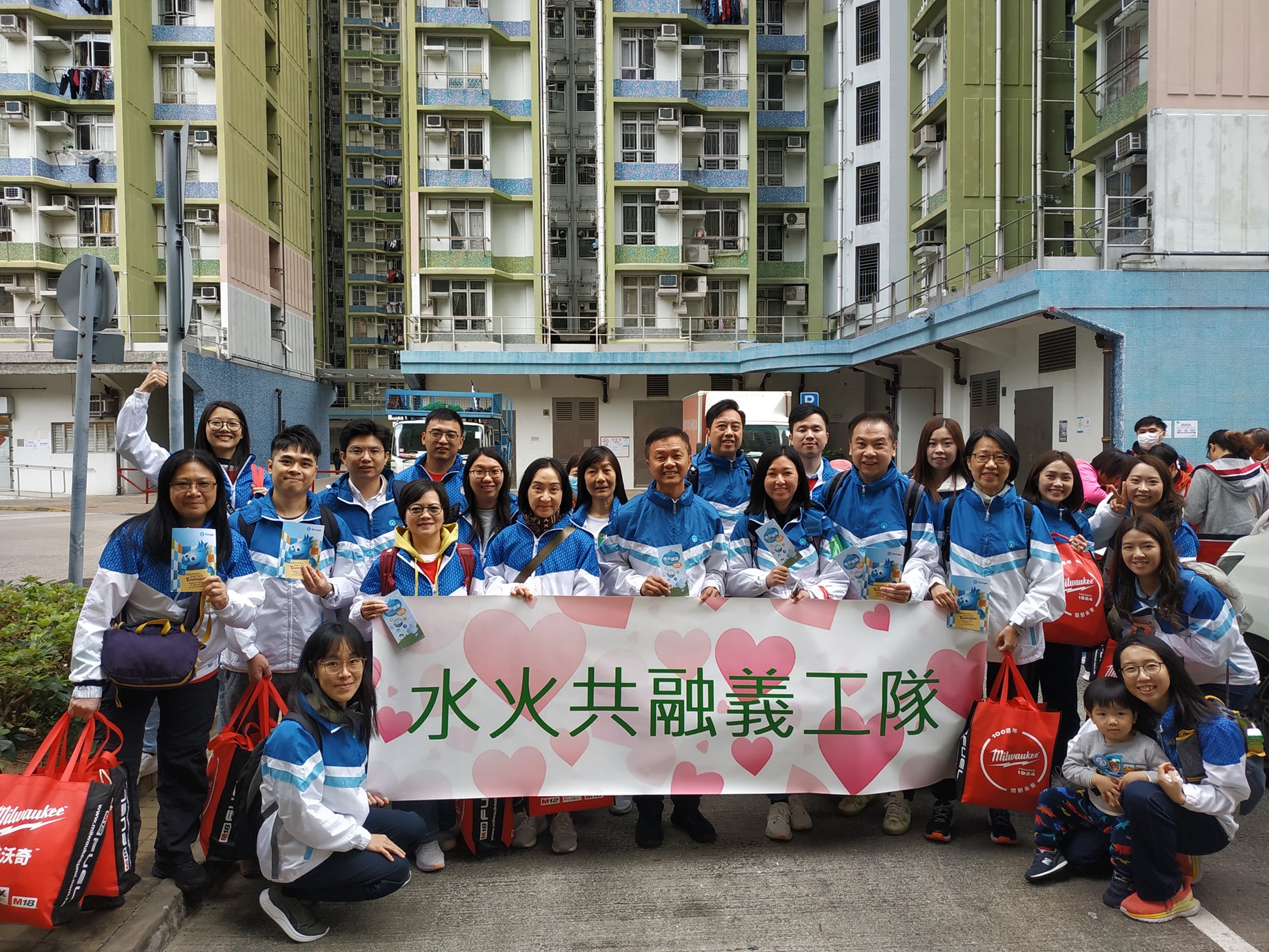 煤气公司温馨义工队与水务署义工队组成的「水火共融义工队」,参与「齐心护老送平安」社区探访,为长者送上温暖。