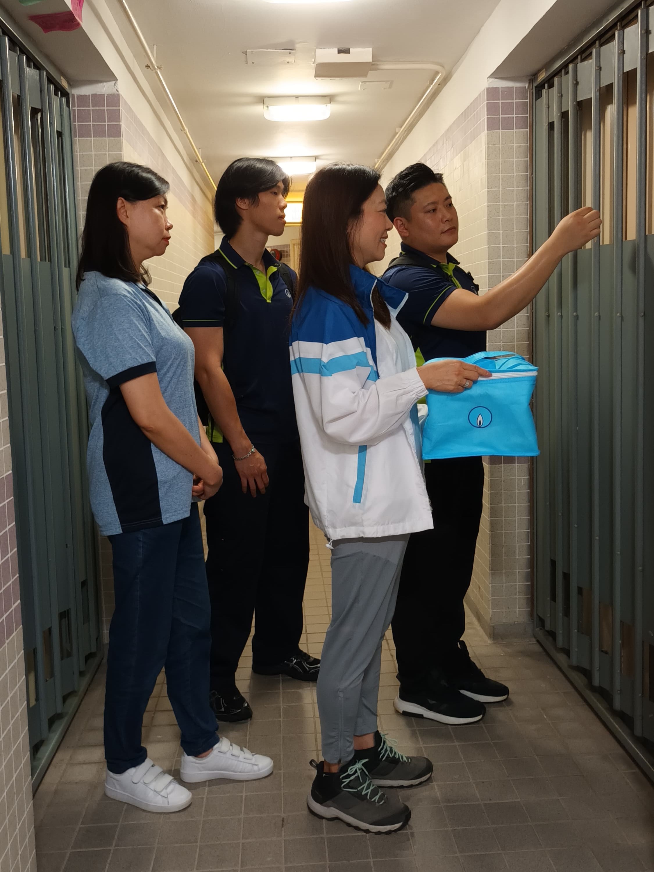 煤气公司企业事务及政府关系总监王佩儿(右二)、总经理—企业事务陈嘉宝(左一)和公司技术员在黑色暴雨警告生效期间携同物资探访基层住户。
