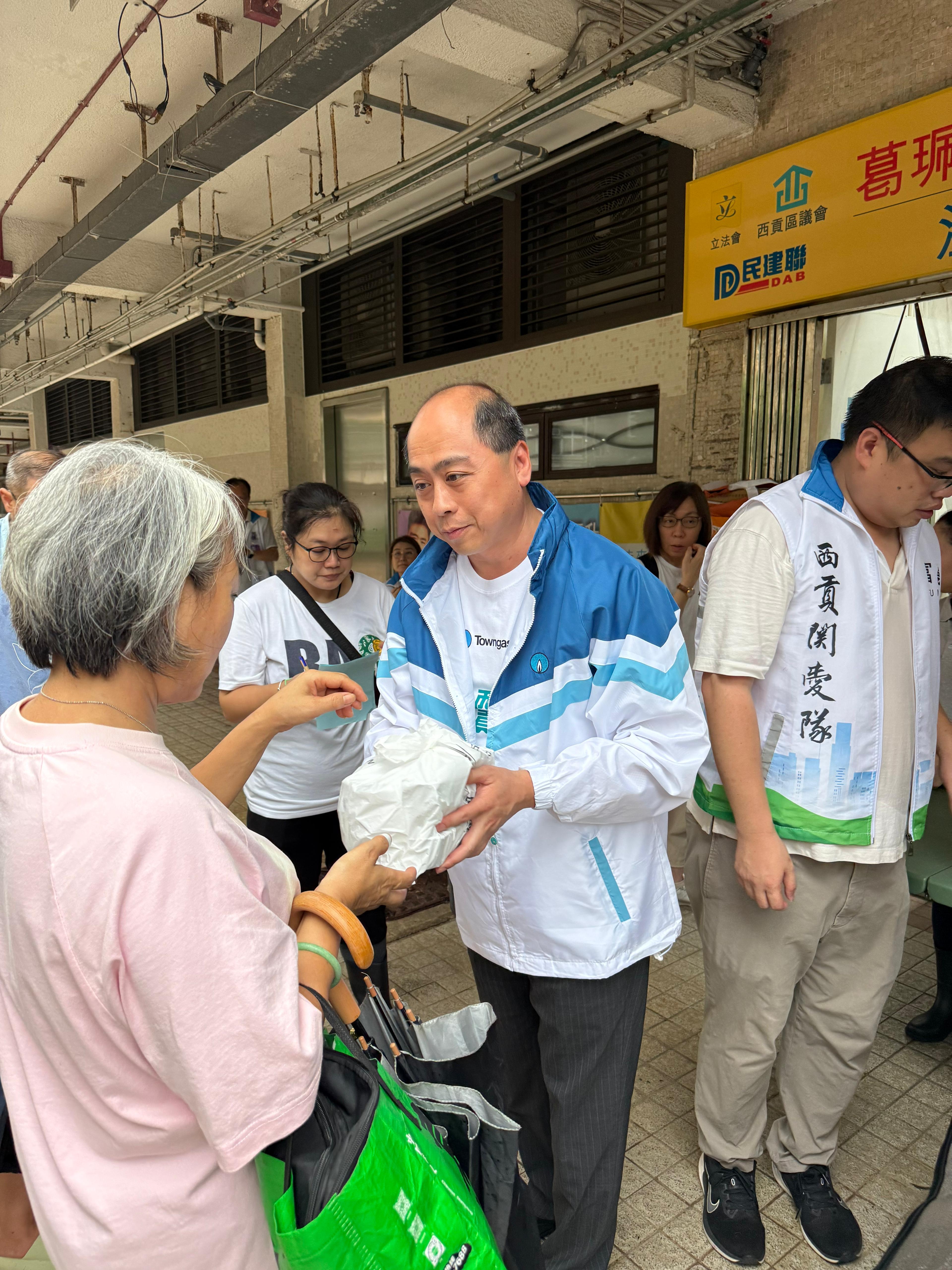 黑色暴雨警告生效期间,煤气公司管理层亲赴多区支援基层家庭及有需要人士。图为煤气公司营运总裁—香港业务郑晓光在将军澳景林村向受停电影响的居民派发饭盒。