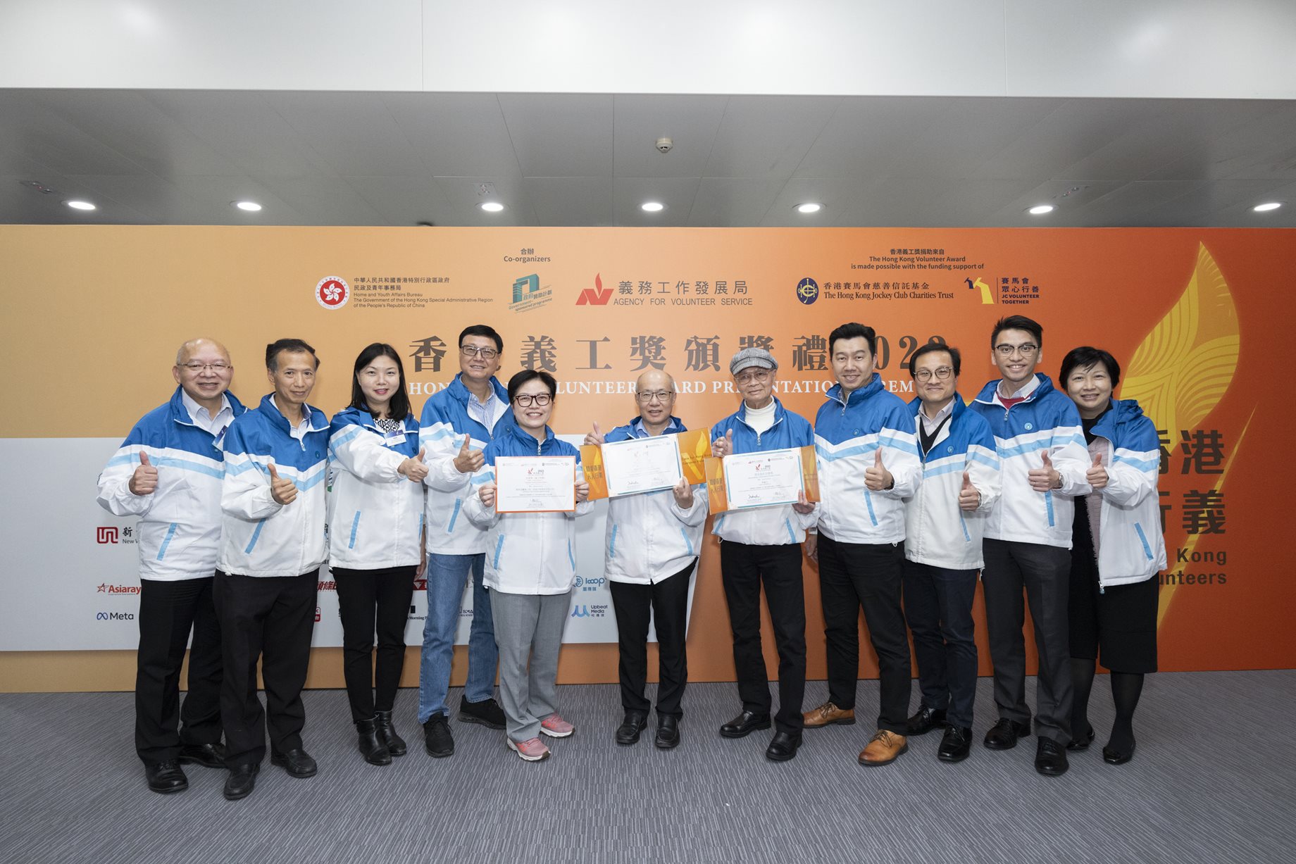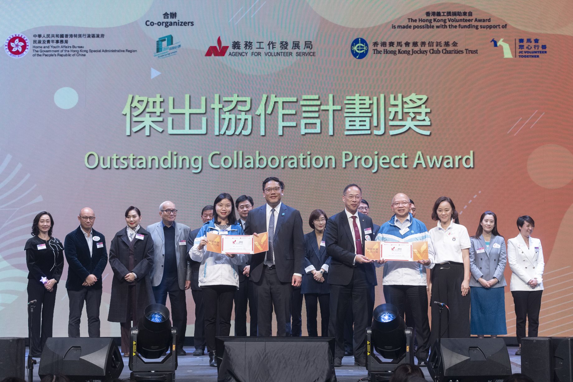 煤氣公司總經理—企業事務陳嘉寶(前左一)、煤氣温馨義工隊隊長梁進發(前右二)及香港聖公會福利協會助理總幹事黃翠恩(前右一)代表接受「香港義工獎2023」的傑出協作計劃獎。